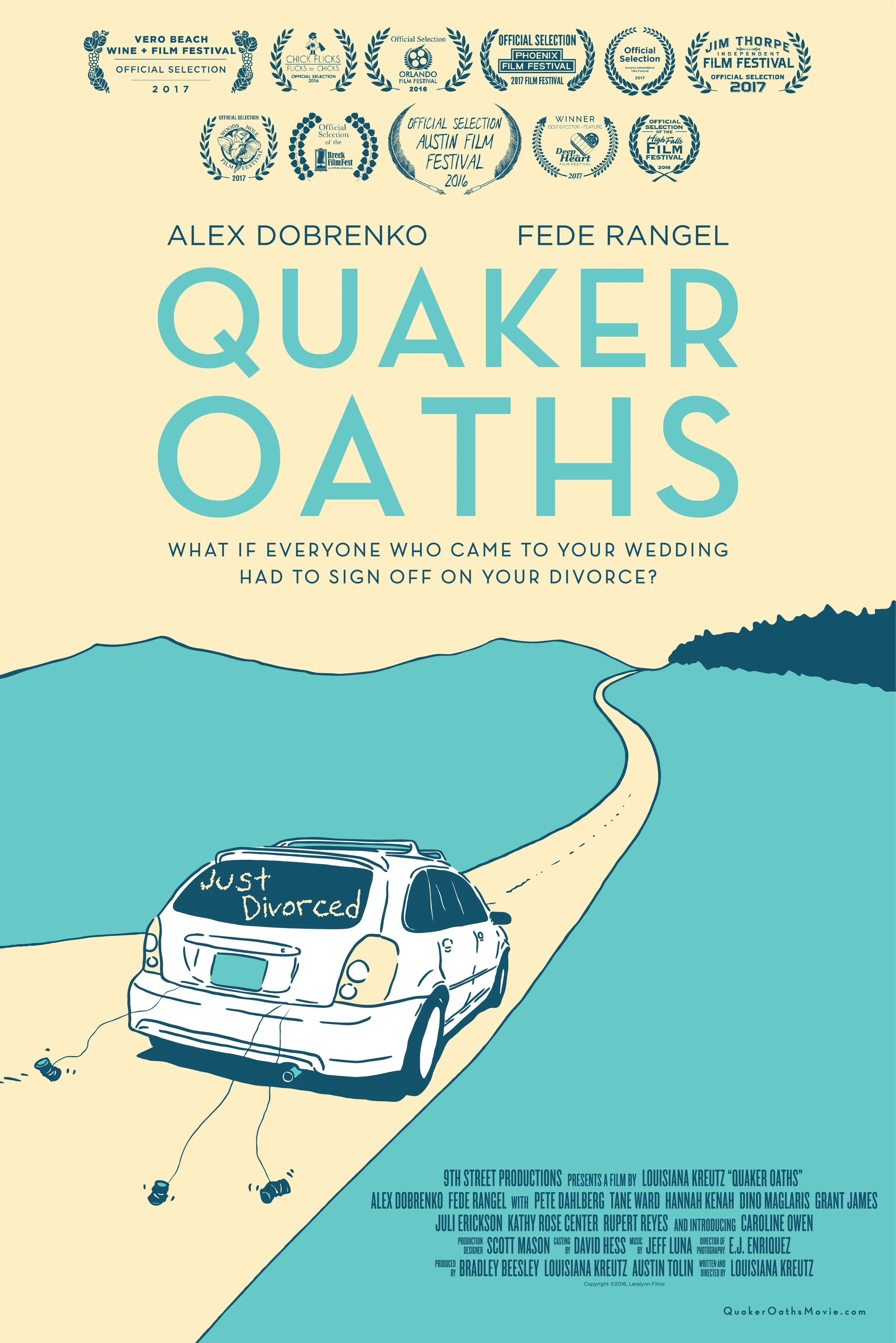 QUAKER OATHS is a narrative feature written and directed by Louisiana Kreutz. It premiered at the Austin Film Festival in October 2016 and went on to play in over a dozen festivals across the country, winning awards such as "Best Comedy" at the Breckenridge Film Festival and the Audience Award at Woods Hole. The film is available to stream on Amazon Prime Video, and DVDs are available at Barnes and Noble, Best Buy, and Amazon.